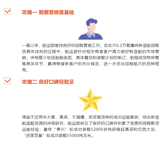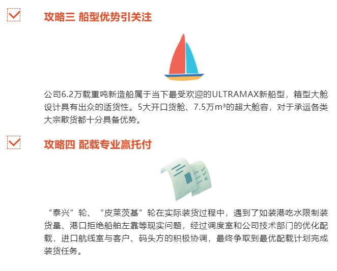 6至7月,公司开发新的匹配货源,安排“泰兴”轮、“皮莱茨基”轮陆续摆位至阿根廷、美国装载高粱、大豆、玉米等粮食货物,成功实现公司承运大宗粮食货物的回程目标。